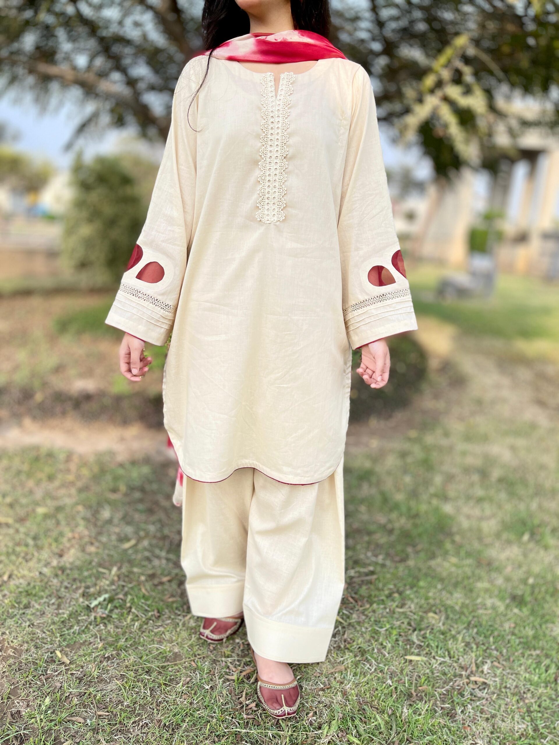 The shirt features detailed sleeve work, adding a refined and stylish touch to the outfit. Paired with a comfortable dyed trouser and complemented by a tie & dye chiffon dupatta, this ensemble creates a balanced and elegant look perfect for day or evening wear.