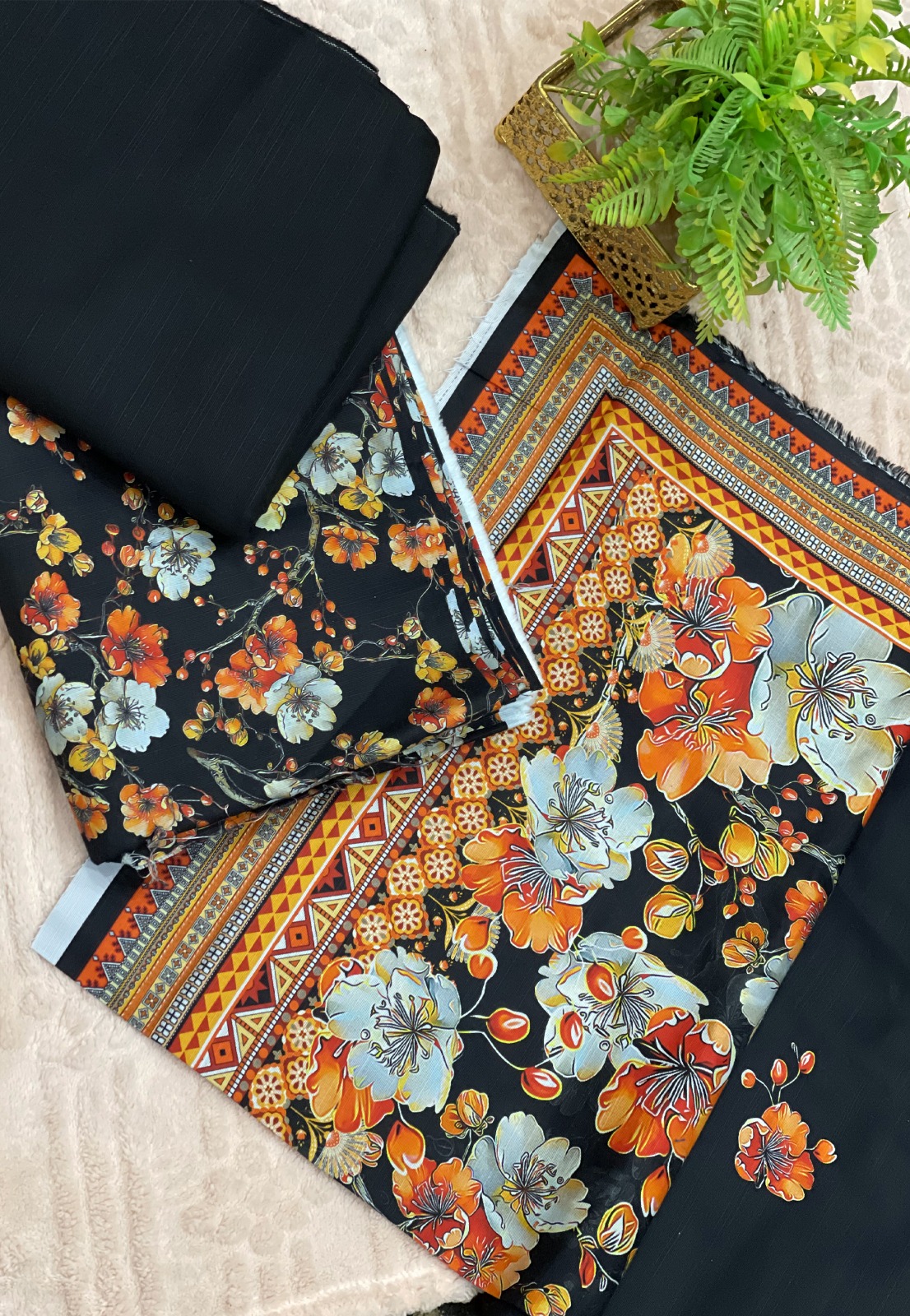 A premium unstitched 3-piece suit designed to add charm and elegance to your winter wardrobe. Made from soft Khaddar fabric, this outfit features a classic black base adorned with vibrant multicolor floral prints, paired with a beautifully coordinated digital printed dupatta.