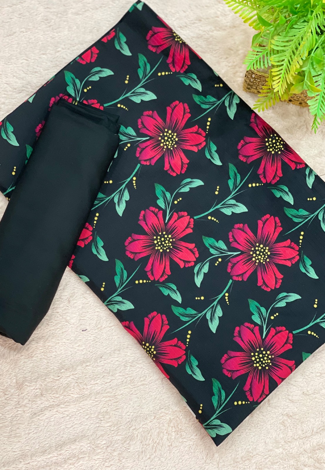 Premium unstitched 2-piece suit made from Doria Lilan fabric, designed for everyday comfort and graceful style. The deep black base combined with bold red floral print creates a striking yet elegant look. Lightweight, breathable and ideal for warm weather, casual gatherings and semi-formal wear. Enjoy full tailoring freedom to customize your perfect fit.