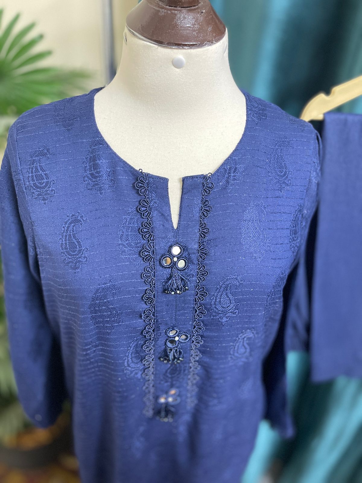A refined stitched 2-piece winter suit designed for elegant everyday wear. Crafted from soft Doria Lilan fabric, this outfit offers warmth, comfort, and a polished look for the colder season. The solid blue color is beautifully enhanced with classy lace details, adding a touch of sophistication to the overall design.