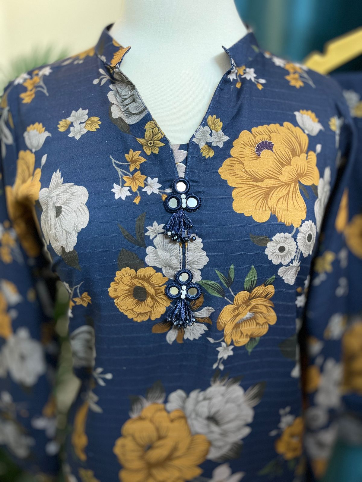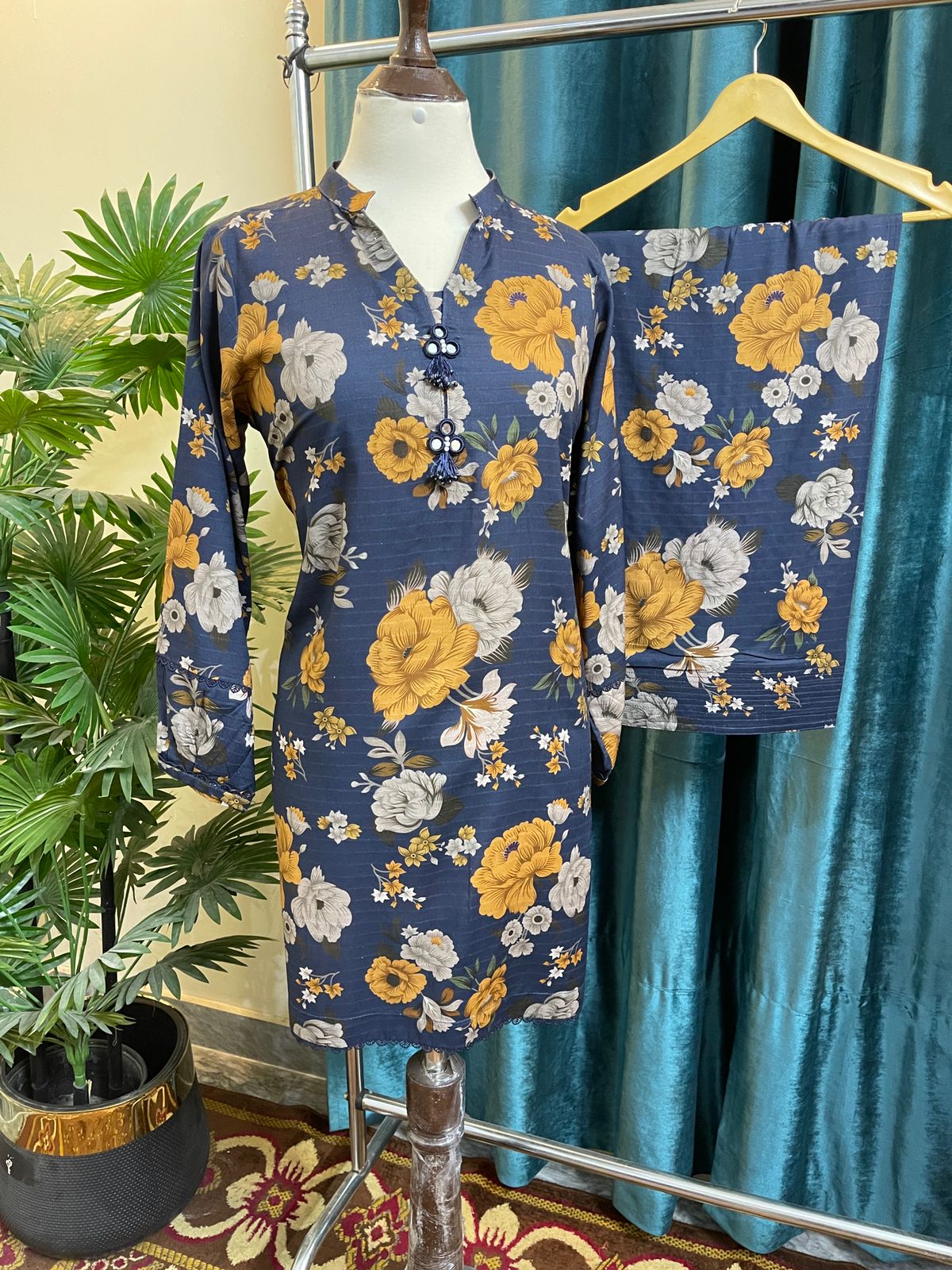 A premium stitched 2-piece winter suit designed for graceful everyday wear. Crafted from smooth and breathable Doria Lilan fabric, this outfit features soft florals on a deep zinc blue base, enhanced with bold all-over floral prints and delicate lace details for an elegant finish.