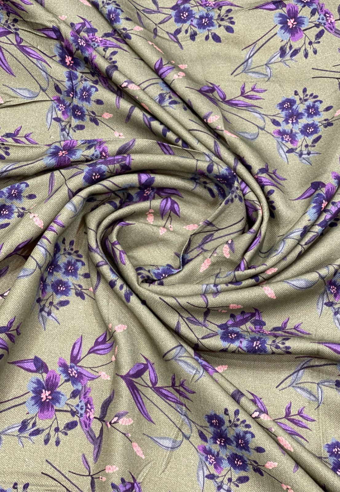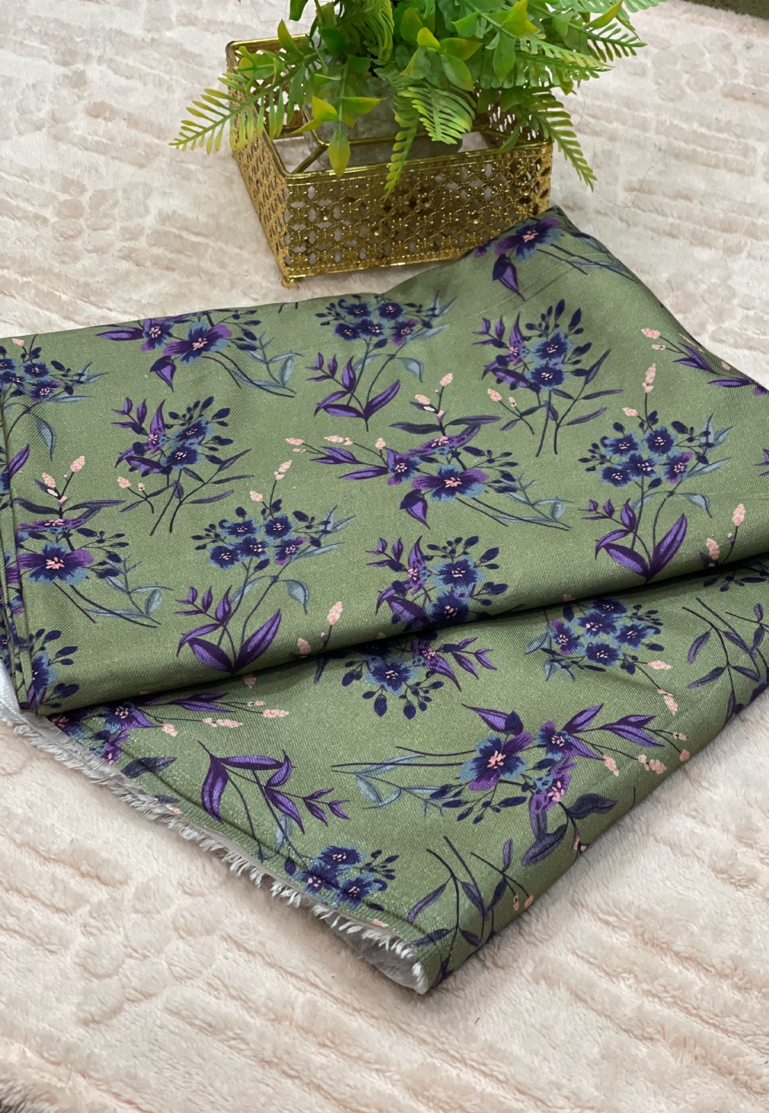 Soft plum floral on a deep olive green base 🍃✨ — our premium unstitched 2-piece suit is crafted from smooth, breathable Marina fabric. Delicate light blooms create an elegant, everyday look with a subtle, graceful touch, perfect for winter styling. Enjoy full tailoring freedom for your ideal fit.