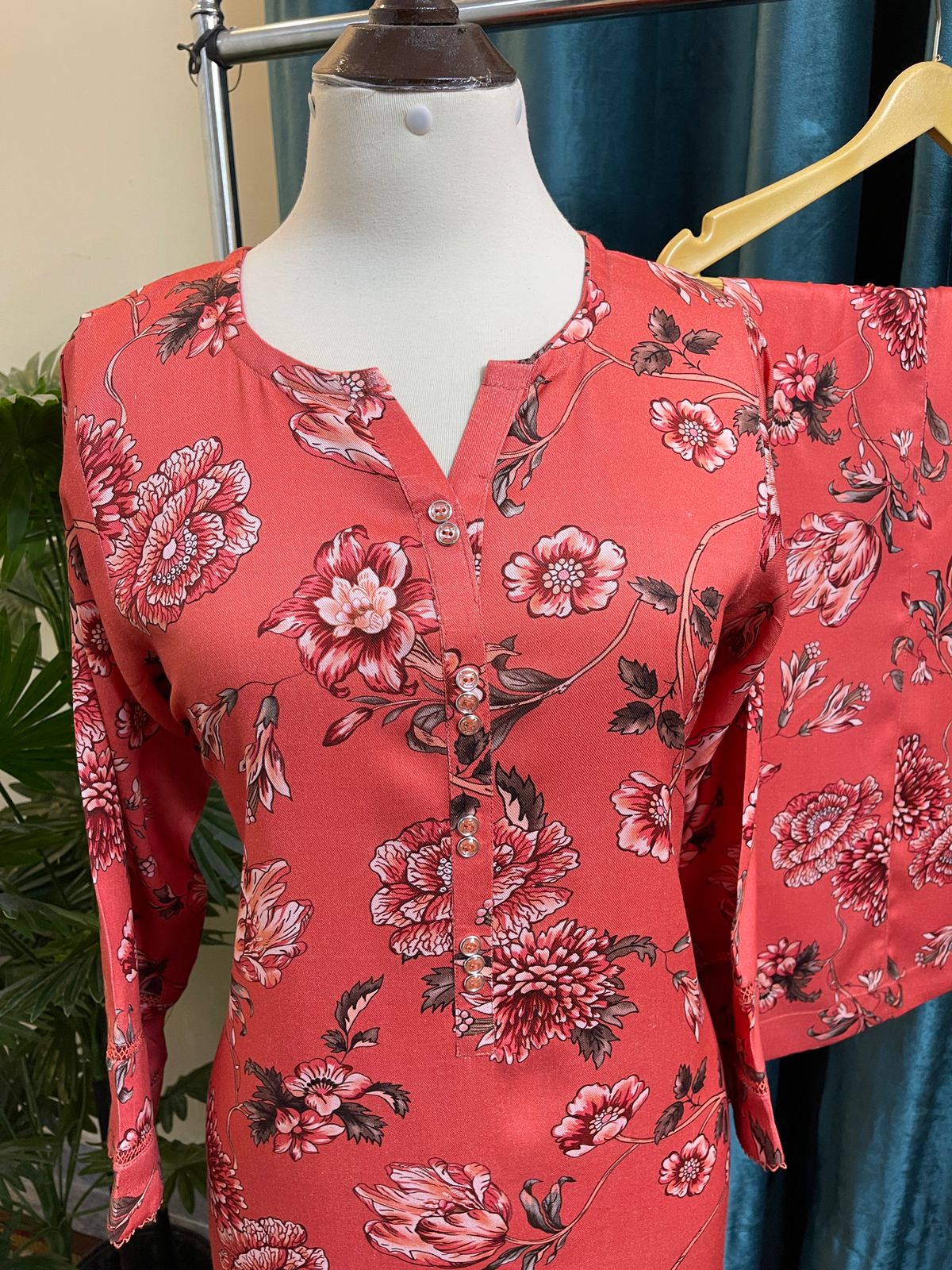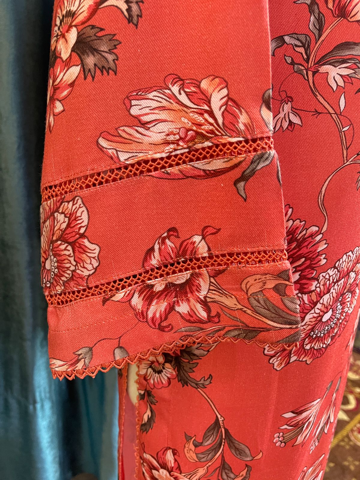 Add warmth and elegance to your winter wardrobe with this premium stitched 2-piece suit crafted from soft Marina fabric. Featuring a rich rust orange base with all-over floral prints, this outfit is enhanced with delicate lace details that elevate its overall look.